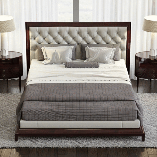 This sleek platform bed embodies minimalist elegance, combining the warmth of natural wood with the softness of a tailored headboard. It is designed for those who appreciate clean lines, modern Scandinavian or Japanese aesthetics, and a calming bedroom environment.