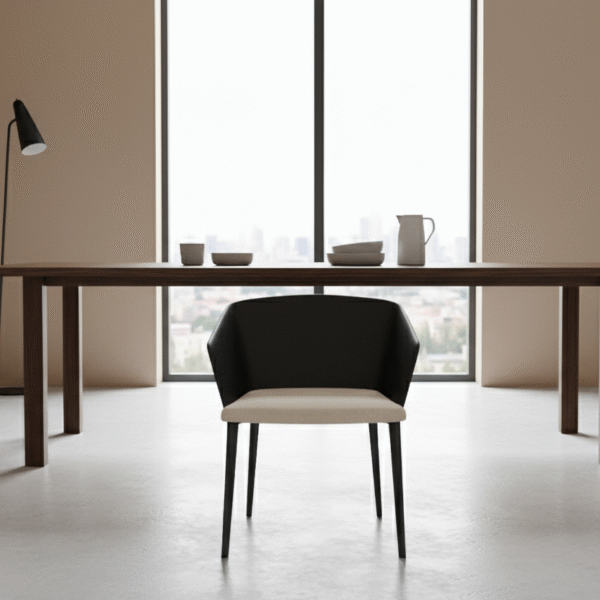 Sleek Modern Dining Chair with Sculpted Back and Padded Seat Elevate your dining space with this strikingly modern chair, a perfect fusion of minimalist form and comfortable function. The chair features a wide, curved black backrest that wraps around to form the arms, crafted from a smooth, dark material like molded wood or metal. This is beautifully contrasted by a plush, rectangular cream or light grey seat cushion. The entire piece is supported by slender, tapered dark metal legs. Key Features: