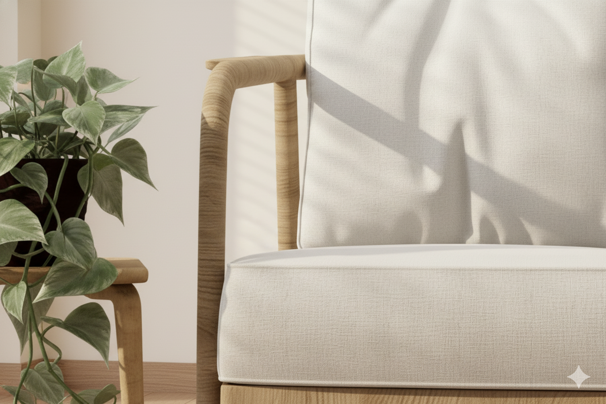 Scandi-Modern Accent Chair with Natural Wood Frame and Crisp White Cushions