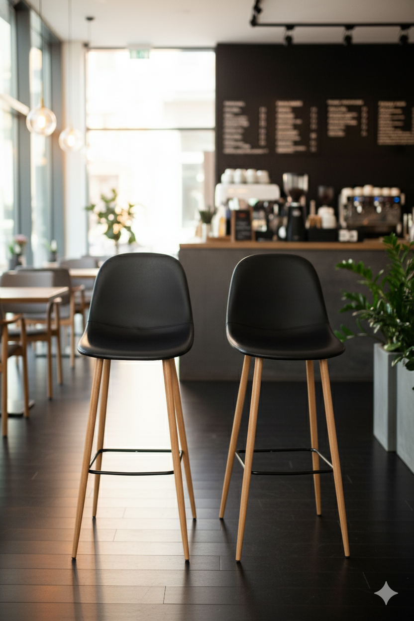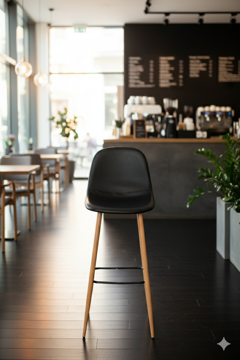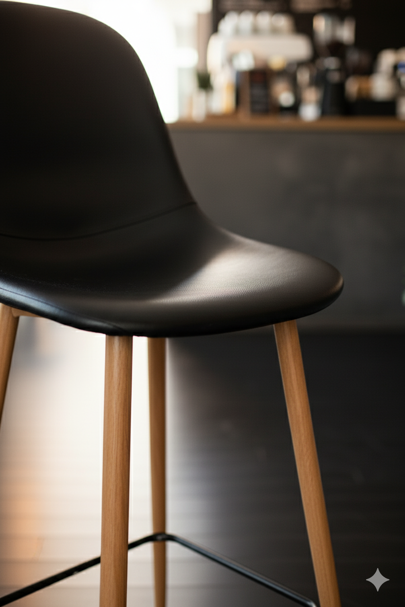 This contemporary bar stool effortlessly combines Scandinavian and mid-century modern design elements. The chair features a single-piece, contoured black plastic or molded wood seat that provides subtle ergonomic support. The dark, sleek seat is beautifully contrasted by a natural-toned, angled wood frame, making it an elegant and versatile addition to any bar or kitchen island.