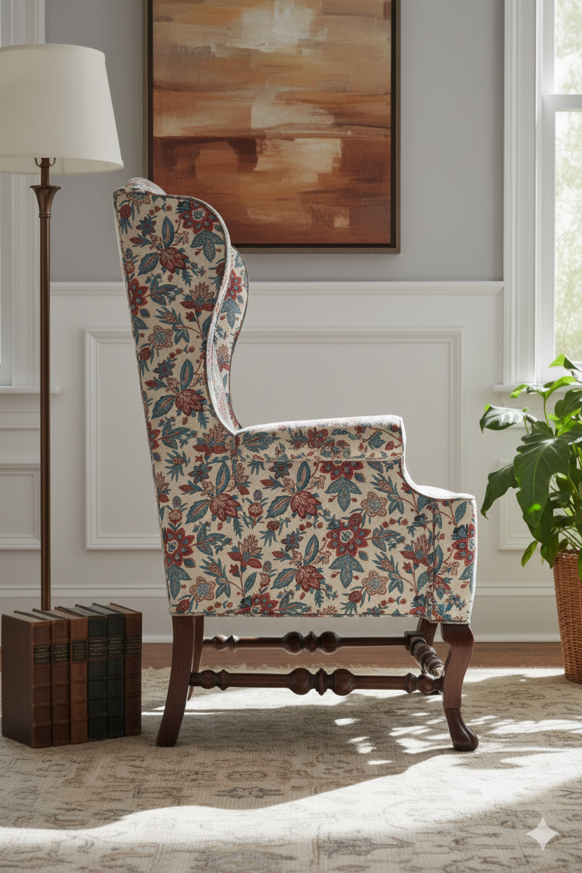 This timeless wingback chair brings a sense of classic, cottage, or traditional charm to any room. It features the distinctive high back and side wings characteristic of English heritage design, upholstered in a cheerful yet refined floral fabric.