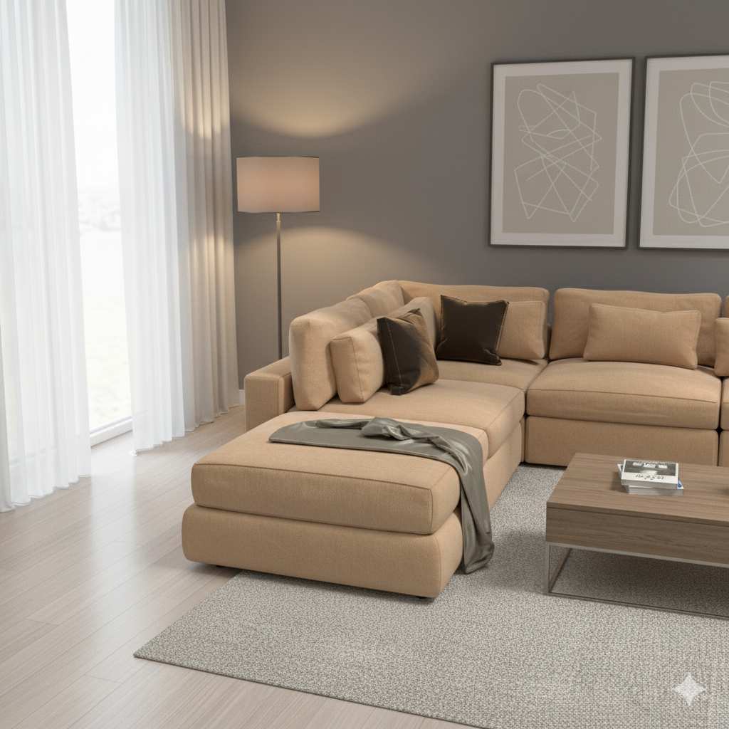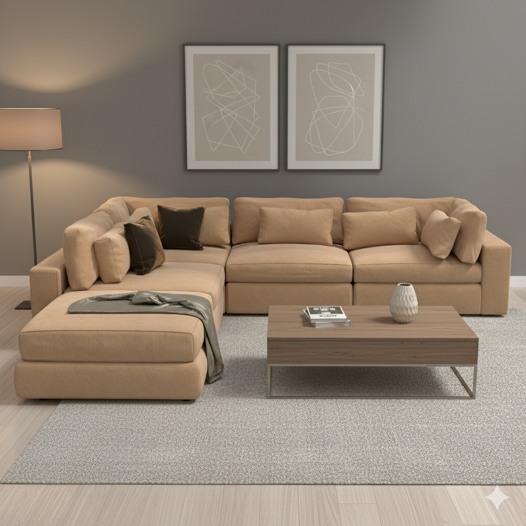 This highly versatile sectional is designed to maximize comfort and functionality in a modern living space. The configuration features an extended chaise lounge and multiple modular seats, allowing you to easily adjust the layout for entertaining or relaxing. Upholstered in a soft, durable fabric in a warm tan or camel color, it brings a cozy, sunlit feel to any room.