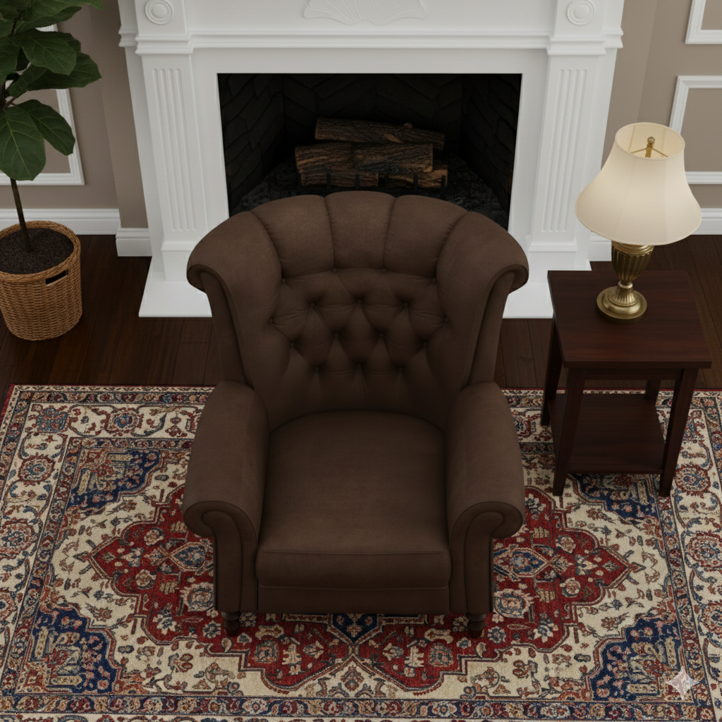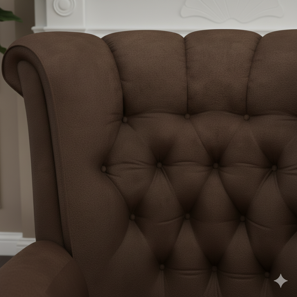 This commanding armchair is the definition of a stately and comfortable classic. With its high, supportive wingback and deep button tufting, it evokes the timeless elegance of a traditional English study or library. The chair is upholstered in a rich, dark chocolate brown suede-like fabric or micro-suede, offering a cozy yet sophisticated texture.
