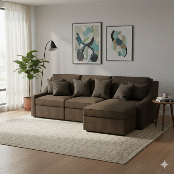 Perfectly balancing modern comfort with a warm, inviting aesthetic, this chaise sofa is designed to be the ultimate lounging spot in your home. The generous, continuous seating surface, combined with a deep, attached chaise, provides ample space for movie nights and relaxation. The solid, dark color anchors the room and hides everyday wear beautifully.